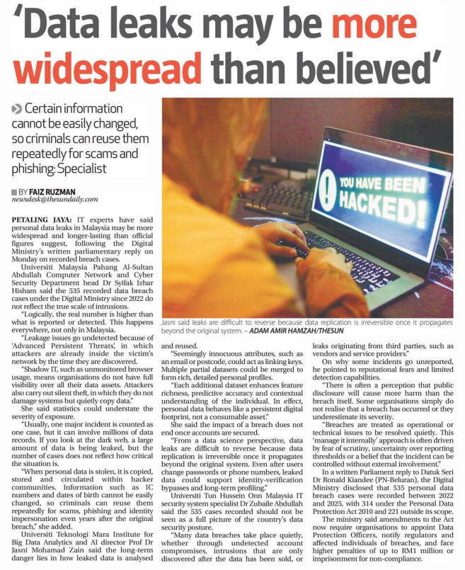 8. The Sun Daily (thesun.my): Data leaks in Malaysia worse than official figures suggest. The statement by Ts. Dr. Zubaile Abdulah, Faculty of Computer Science and Information Technology (FSKTM), UTHM