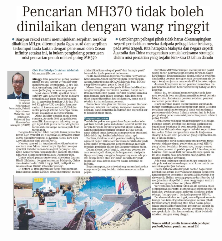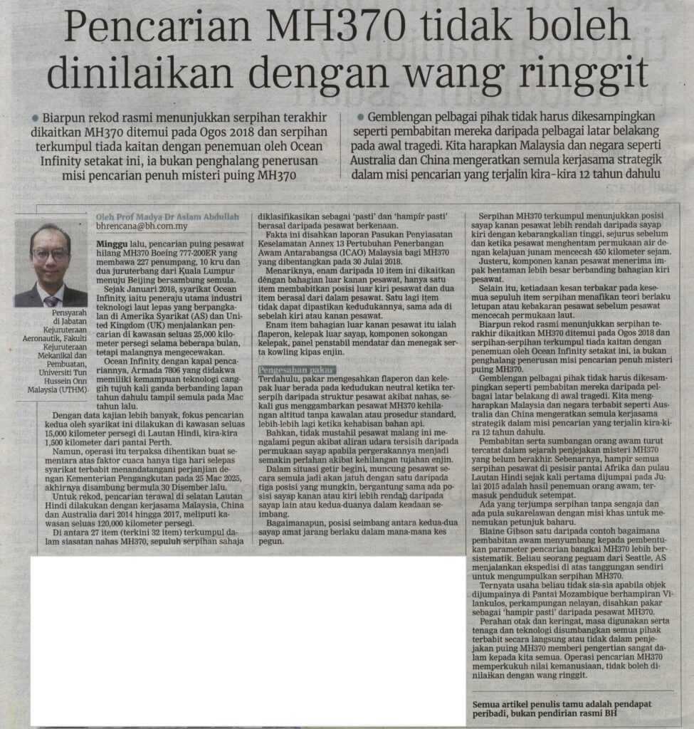 2. Berita Harian (bharian.com.my): Pencarian MH370 tidak boleh dinilaikan dengan wang ringgit oleh Prof. Madya Ts. Dr. Aslam Abdullah, Fakulti Kejuruteraan Mekanikal dan Pembuatan (FKMP), UTHM