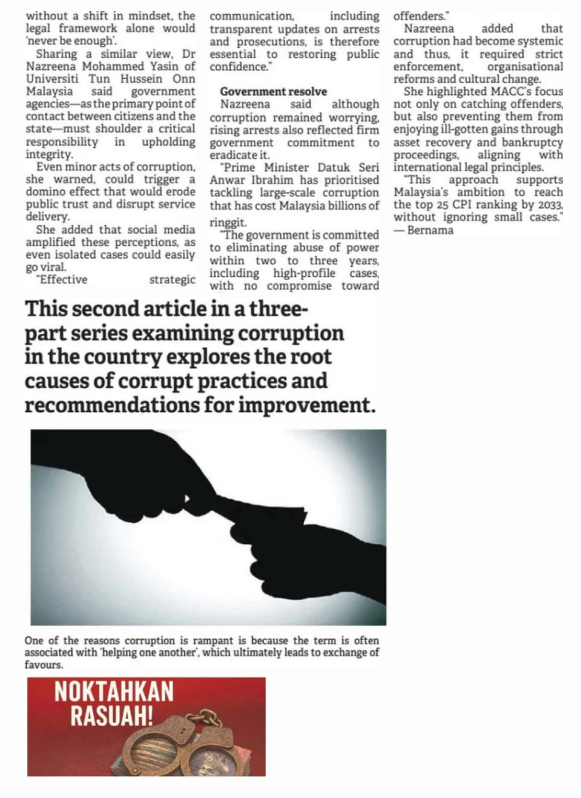 8. Borneo Post (Kuching) (page: 10): `CPI as a benchmark in ending corruption’. The statement by Dr. Nazreena Mohammed Yasin, Centre for General Studies and Co-curricular (PPUK), UTHM