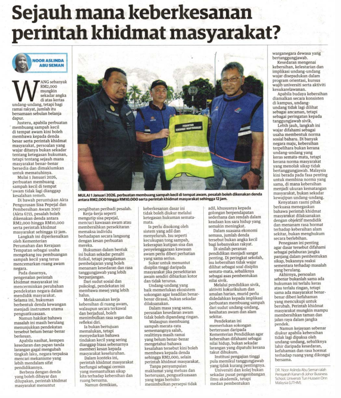 6. Utusan (utusan.com.my): Sejauh mana keberkesanan perintah khidmat masyarakat? oleh Dr. Noor Aslinda Abu Seman, Johor Business School (JBS), UTHM