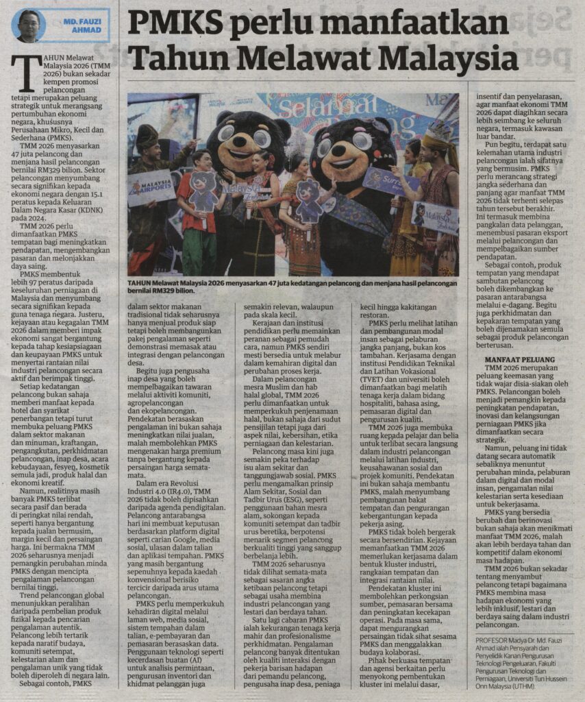 Tahun Melawat Malaysia 2026 merupakan peluang keemasan yang tidak wajar disia-siakan oleh PMKS. Dalam persekitaran ekonomi yang mencabar, pelancongan boleh menjadi pemangkin kepada peningkatan pendapatan, inovasi dan kelangsungan perniagaan PMKS jika dimanfaatkan secara strategik.