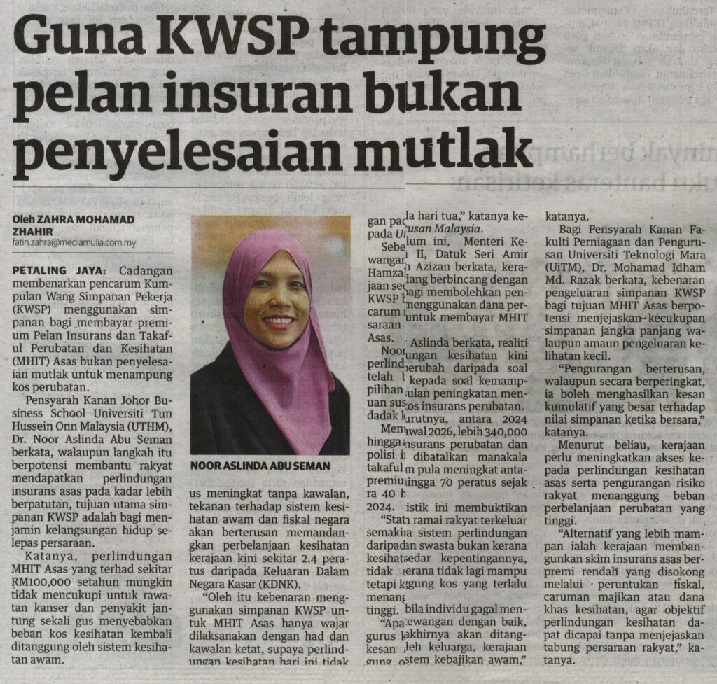 2. Utusan (utusan.com.my): Guna KWSP tampung pelan insuran bukan penyelesaian mutlak. Kenyataan daripada Dr. Noor Aslinda Abu Seman, Johor Business School (JBS), UTHM