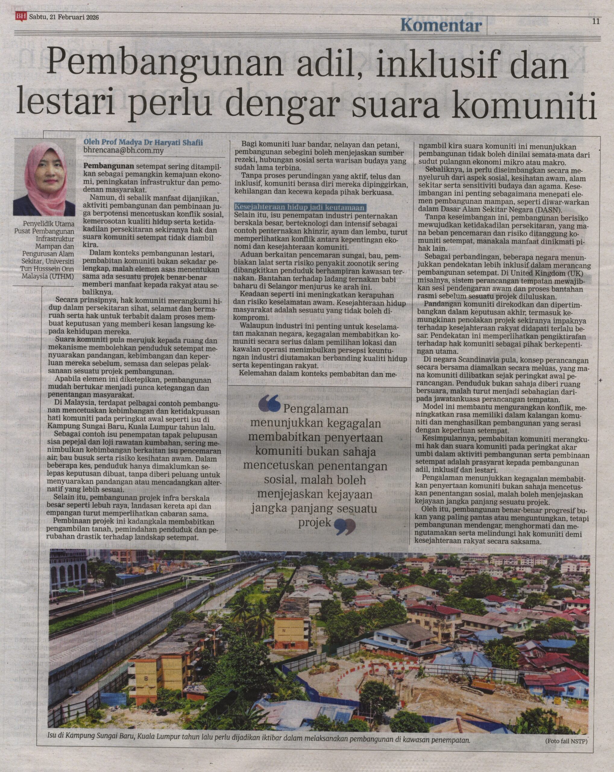 2. Berita Harian (www.bharian.com.my): Pembangunan adil, inklusif dan lestari perlu dengar suara komuniti oleh Prof. Madya Dr. Haryati Shafii, Fakulti Pengurusan Teknologi dan Perniagaan (FPTP), UTHM