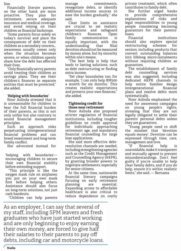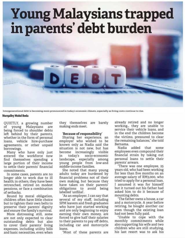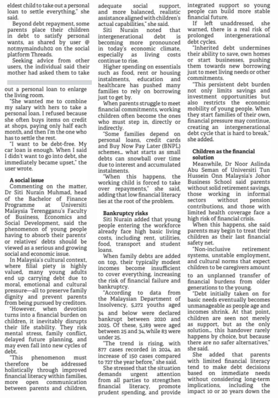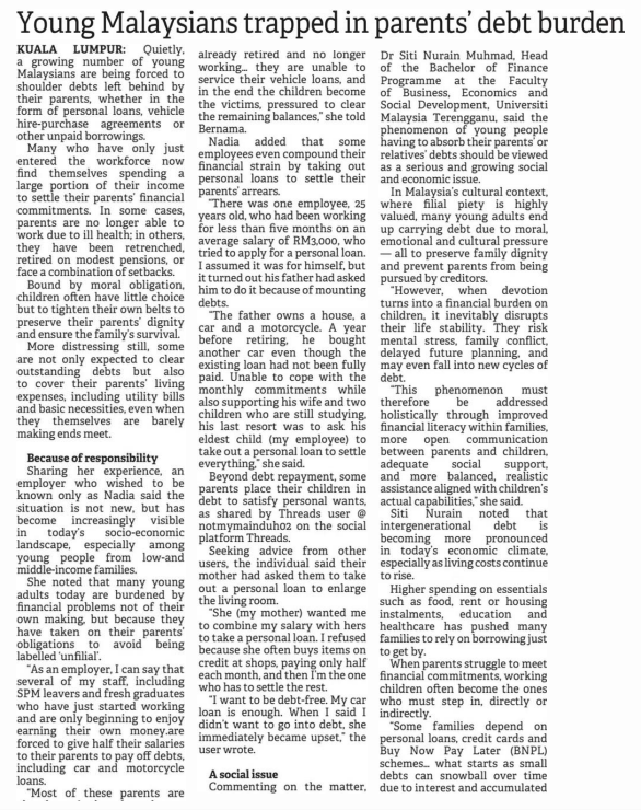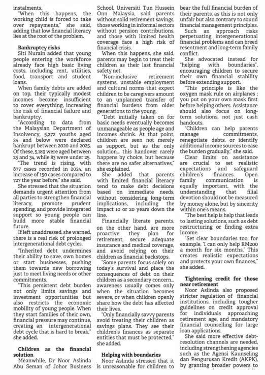5. Borneo Post (Kuching) (page: 8): Young Malaysians trapped in parents’ debt burden. The statement by Dr. Noor Aslinda Abu Seman, Johor Business School (JBS), UTHM