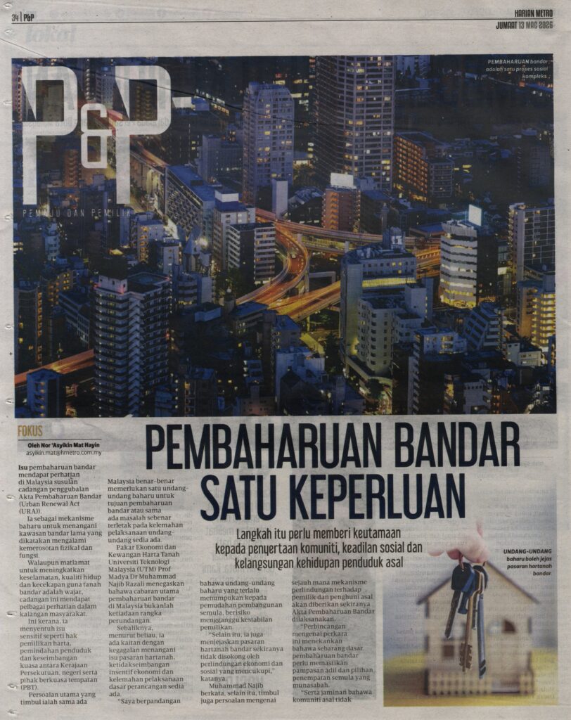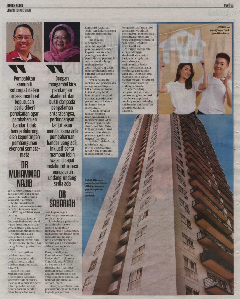 3. Harian Metro (muka surat: 34 dan 35): PEMBAHARUAN BANDAR SATU KEPERLUAN. Kenyataan daripada Dr. Sabariah Eni, Fakulti Pengurusan Teknologi dan Perniagaan (FPTP), UTHM