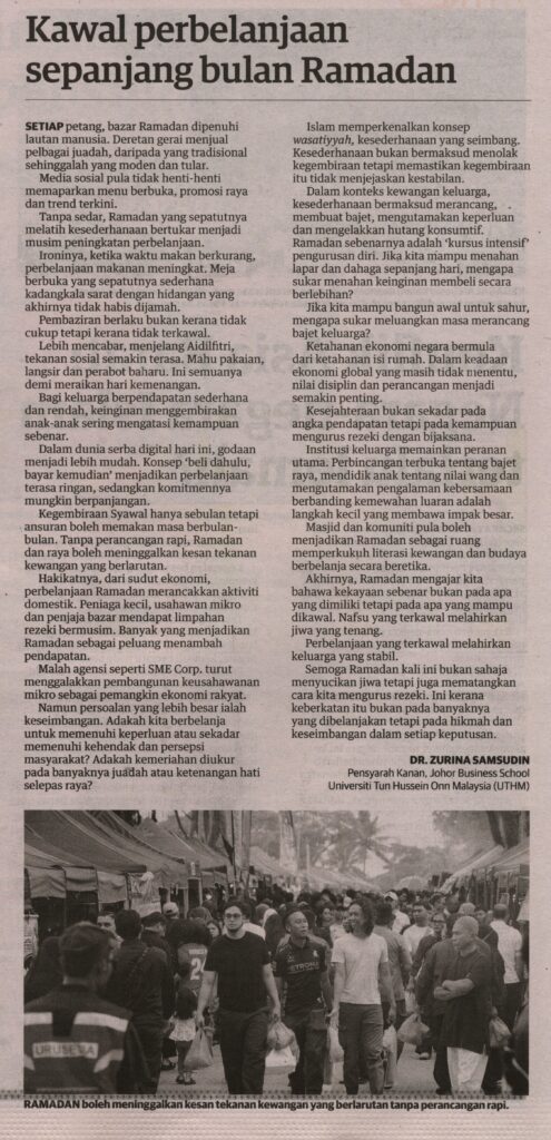 2. Utusan (utusan.com.my): Kawal perbelanjaan sepanjang bulan Ramadan oleh Dr. Zurina Samsudin, Johor Business School (JBS), UTHM