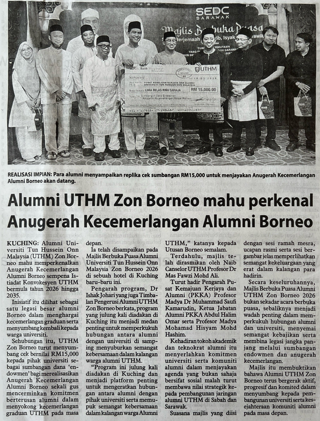 6. Utusan Borneo Online (utusanborneo.com.my): Alumni UTHM Zon Borneo mahu perkenal Anugerah Kecemerlangan Alumni Borneo