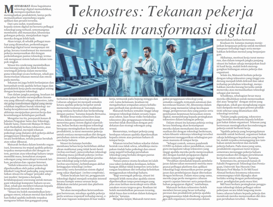 6. Bernama (bernama.com): TEKNOSTRES: TEKANAN SENYAP PEKERJA DI SEBALIK TRANSFORMASI DIGITAL. Kenyataan daripada Prof. Madya Ts. Dr. Md Fauzi Ahmad, Fakulti Pengurusan Teknologi dan Perniagaan (FPTP), UTHM