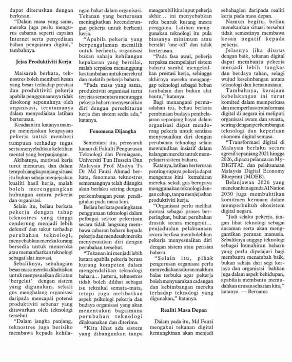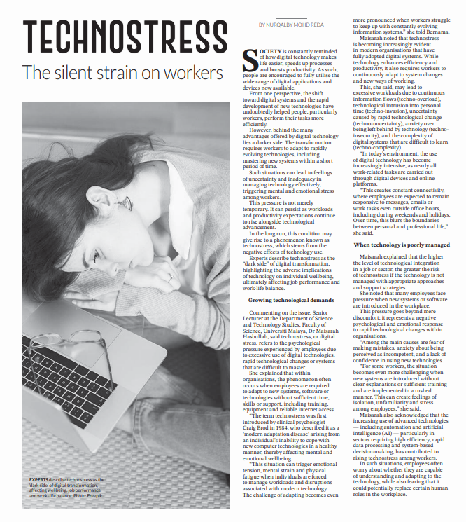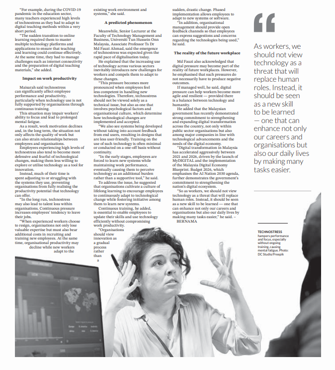 8. New Sunday Tribune (page: 2 to 3): TECHNOSTRESS The silent strain on workers. The statement by Assoc. Prof. Ts. Dr. Md Fauzi Ahmad, Faculty of Technology Management and Business  (FPTP), UTHM