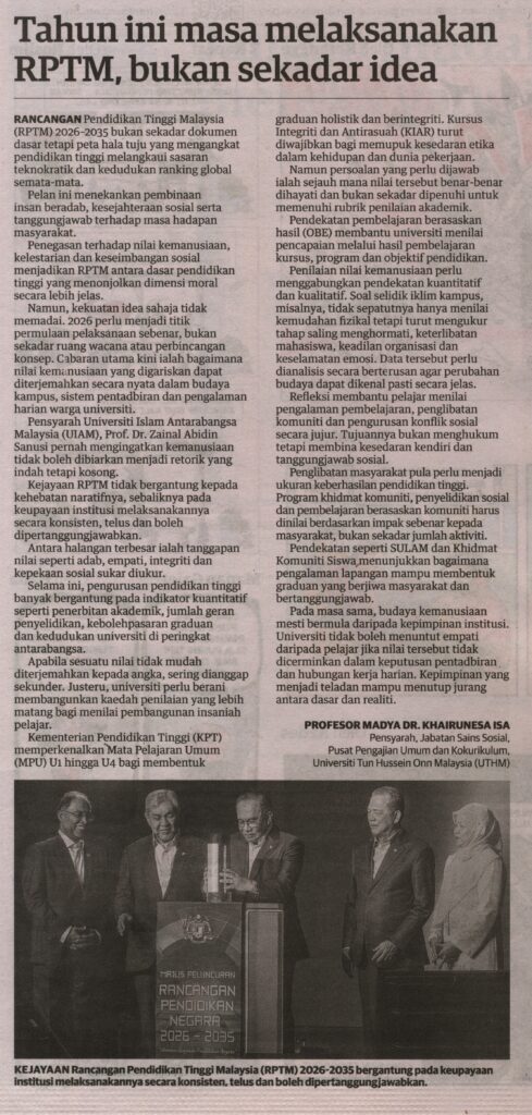 2. Utusan (utusan.com.my): Tahun ini masa melaksanakan RPTM, bukan sekadar idea oleh Prof. Madya Dr. Khairunesa Isa, Pusat Pengajian Umum dan Kokurikulum (PPUK), UTHM