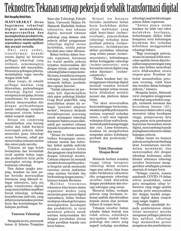 4. Utusan Borneo Sarawak (muka surat: 9): Teknostres: Tekanan senyap pekerja di sebalik transformasi digital. Kenyataan daripada Prof. Madya Ts. Dr. Md Fauzi Ahmad, Fakulti Pengurusan Teknologi dan Perniagaan (FPTP), UTHM