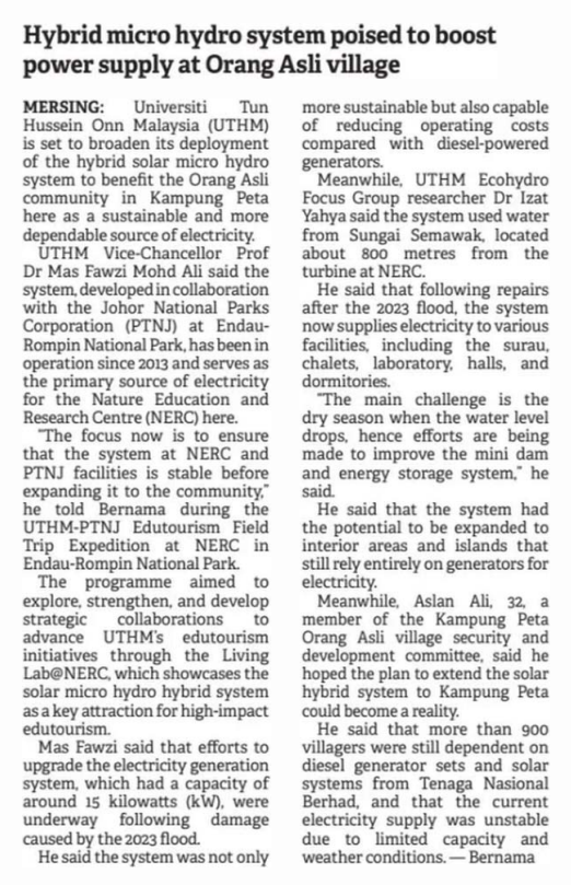 2. Bernama (bernama.com): UTHM Hybrid Micro Hydro System Poised To Boost Power Supply For Orang Asli In Kampung Peta