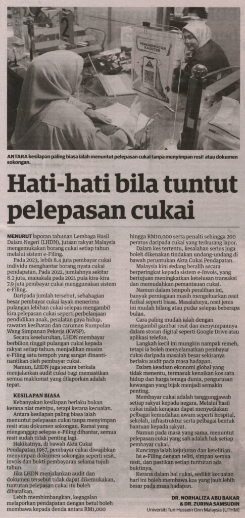 2. Utusan (utusan.com.my): Hati-hati bila tuntut pelepasan cukai oleh Dr. Norhaliza Abu Bakar, Pusat Pengajian Diploma (PPD) dan Dr. Zurina Samsudin, Johor Business School (JBS), UTHM