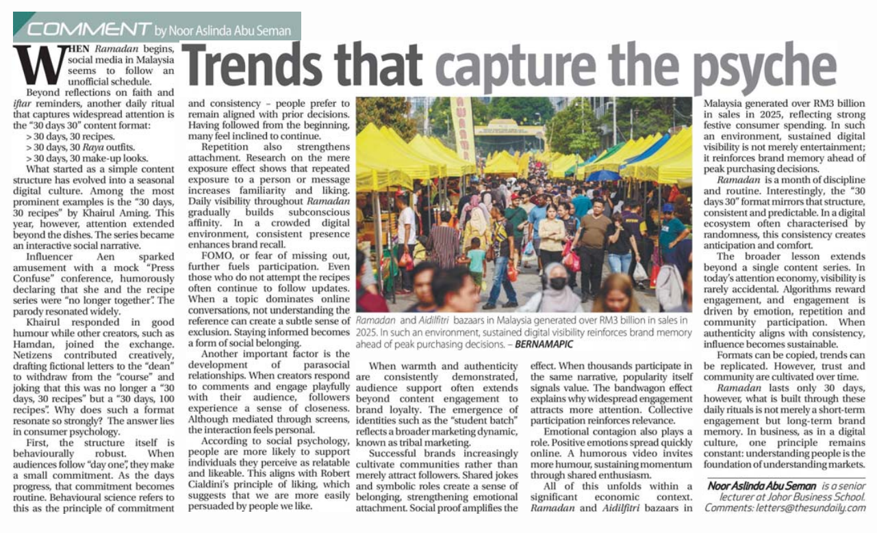 6. The Sun Daily (thesun.my): Trends that capture the psyche by Dr. Noor Aslinda Abu Seman, Johor Business School (JBS), UTHM