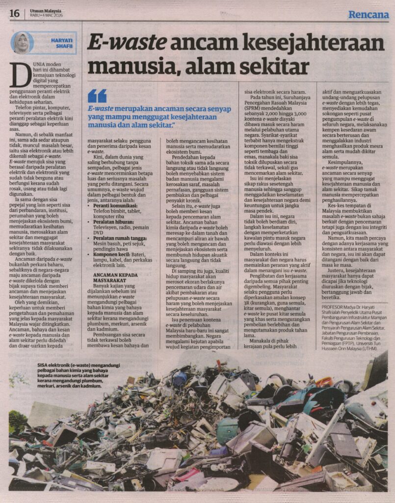 2. Utusan (utusan.com.my): E-waste ancam kesejahteraan manusia, alam sekitar oleh Prof. Madya Dr. Haryati Shafii, Fakulti Pengurusan Teknologi dan Perniagaan (FPTP), UTHM